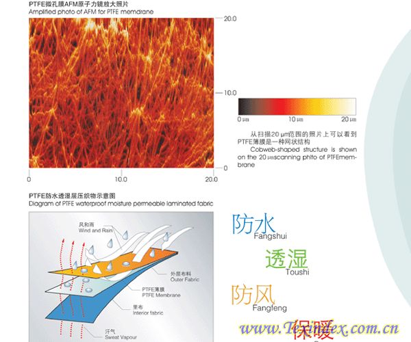 特點:防水、防毒、防腐、透氣、透濕、保暖、耐寒、耐老化、耐水洗、回彈性好、不起泡、環保,被稱為會呼吸的面料。