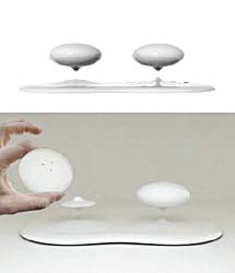 這其實是一只磁懸浮調(diào)料瓶,它的整體被設(shè)計成白色,共有三個部分:調(diào)料瓶、底座與基座。兩個橢圓形的調(diào)料瓶被安放在磁體支撐的小巧底座上,而這兩個小巧的底座通過與基座之間的磁力作用懸浮在空中從而起到對調(diào)料瓶的支撐作用。